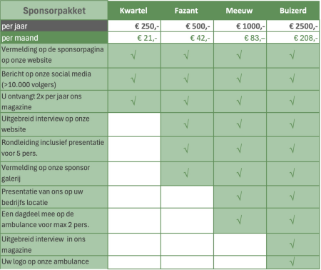 Heeft u er wel eens over nagedacht om ons te sponsoren? Uw bijdrage zorgt ervoor dat onze ambulances blijven rijden. Zo kunnen onze vrijwilligers de dieren in de omgeving helpen waar nodig, Daarnaast moeten we ons pand kunnen blijven onderhouden. Als sponsor draagt u bij aan de maatschappij, en kunt u extra invulling geven aan uw eigen kernwaarden of duurzaamheid strategie. Samen met onze sponsoren hebben wij hetzelfde doel voor ogen: het verlenen van hulp en bijstand aan dieren die zich in een hulpbehoevende situatie bevinden.